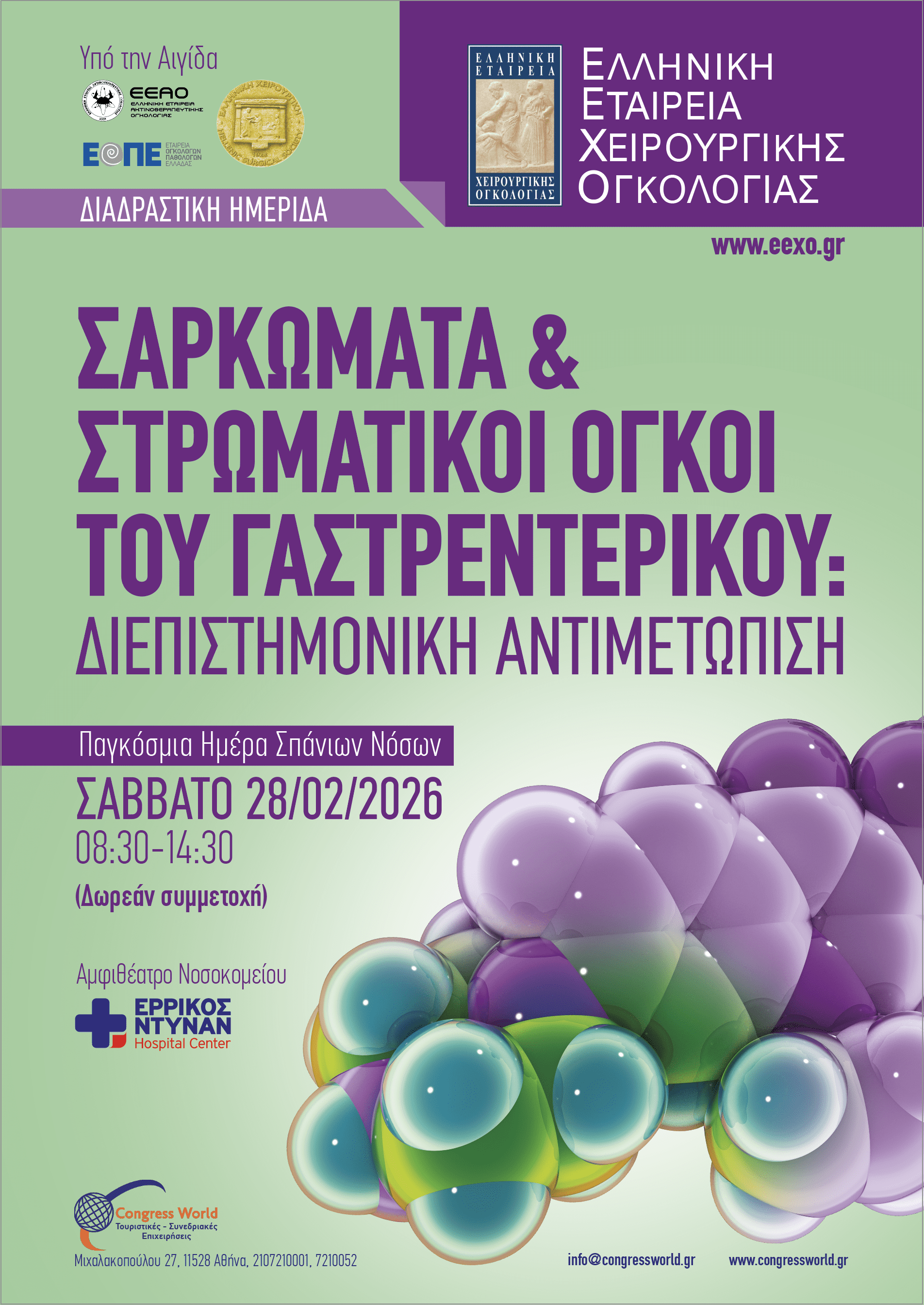Αγαπητοί συνάδελφοι, φίλες και φίλοι,Η Ελληνική Εταιρεία Χειρουργικής Ογκολογίας (ΕΕΧΟ), το Σάββατο 28/2/2026 στο Αμφιθέατρο του Νοσοκομείου Ερρίκος Ντυνάν, θα πραγματοποιήσει την διαδραστική ημερίδα: “Σαρκώματα…
