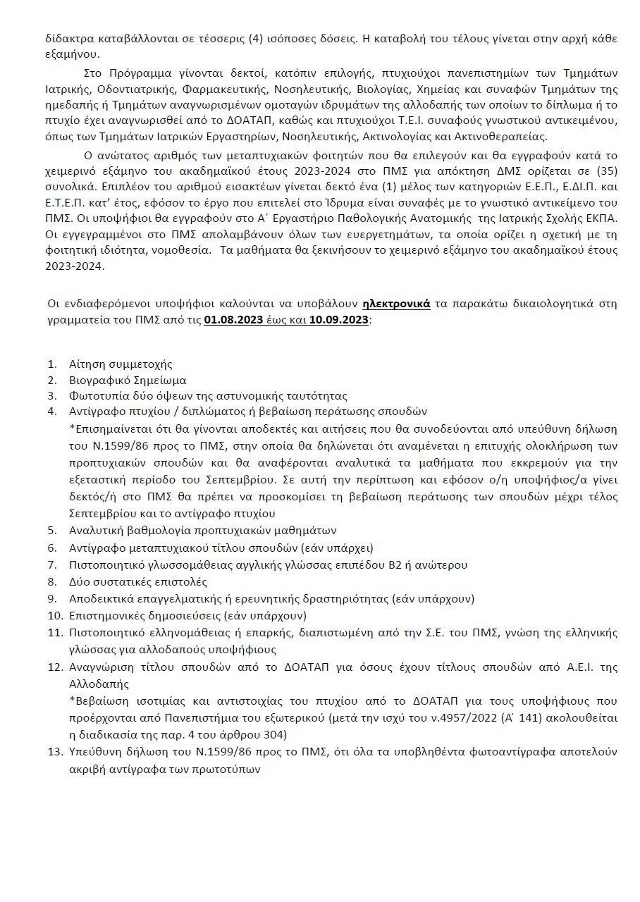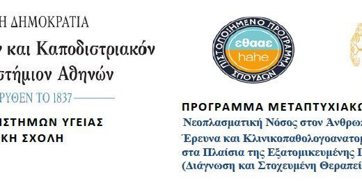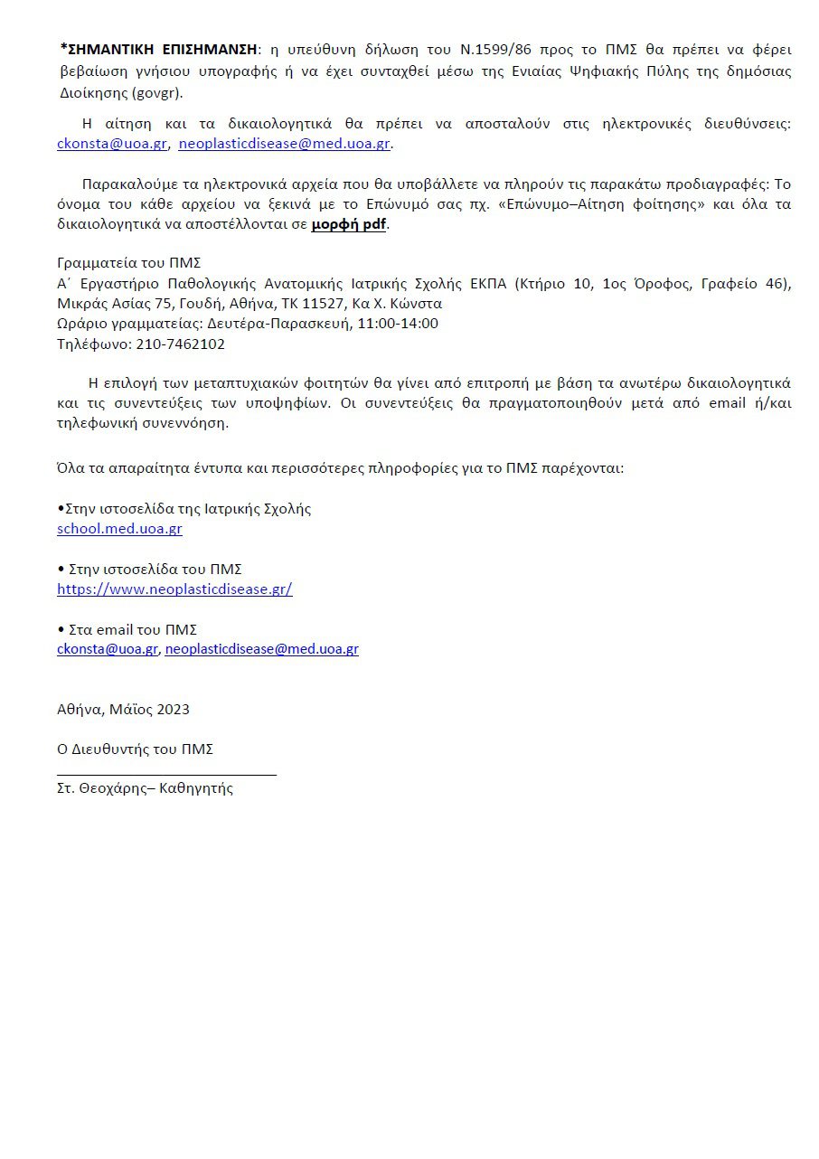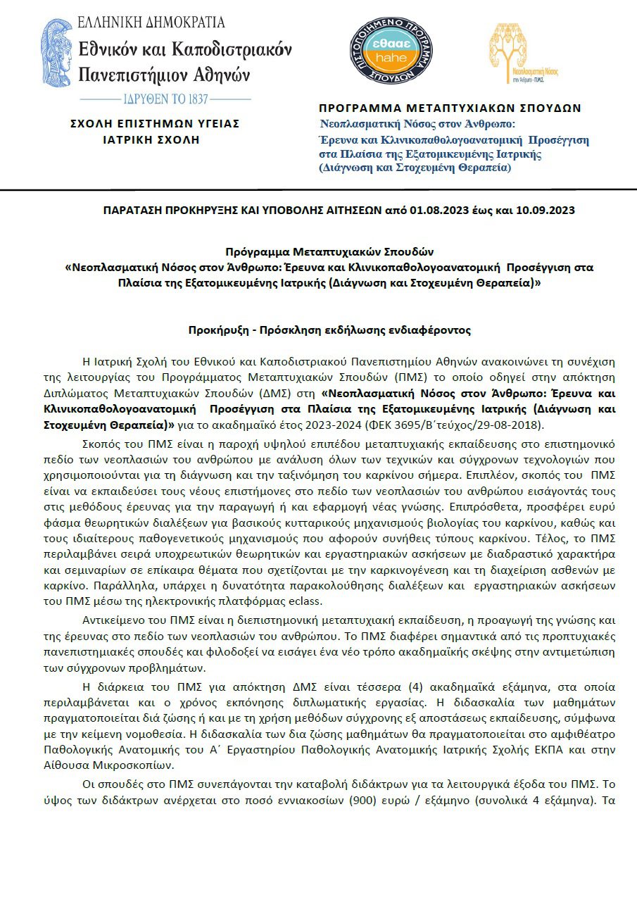 Η Ιατρική Σχολή του Εθνικού και Καποδιστριακού Πανεπιστημίου Αθηνών ανακοινώνει τη συνέχιση της λειτουργίας του Προγράμματος Μεταπτυχιακών Σπουδών (ΠΜΣ) το οποίο οδηγεί στην απόκτηση Διπλώματος Μεταπτυχιακών Σπουδών (ΔΜΣ) στη «Νεοπλασματική Νόσος στον Άνθρωπο: Έρευνα και Κλινικοπαθολογοανατομική Προσέγγιση στα Πλαίσια της Εξατομικευμένης Ιατρικής (Διάγνωση και Στοχευμένη Θεραπεία)» για το ακαδημαϊκό έτος 2023-2024 (ΦΕΚ 3695/Β΄τεύχος/29-08-2018).