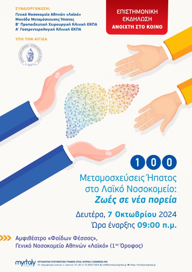 Επιστημονική Εκδήλωση υπό τον τίτλο: «100 Μεταμοσχεύσεις Ήπατος στο Λαϊκό Νοσοκομείο: Ζωές σε νέα πορεία» Δευτέρα, 7 Οκτωβρίου 2024 (Ώρα έναρξης: 09:00 π.μ.), στο Aμφιθέατρο «Φαίδων Φέσσας» του Γ.Ν.Α. «Λαϊκό» (1ος Όροφος). Η εκδήλωση αυτή, αποτελεί ορόσημο για την ολοκλήρωση της διενέργειας 100 μεταμοσχεύσεων στο Λαϊκό Νοσοκομείο και την έναρξη μιας νέας εποχής στον σημαντικό αυτό τομέα. Την επιστημονική εκδήλωση συνδιοργανώνουν…
