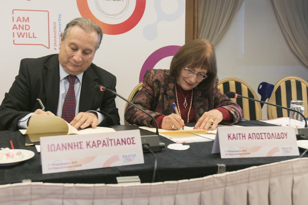 Η ήδη εποικοδομητική συνεργασία μεταξύ της Ελληνικής Εταιρείας Χειρουργικής Ογκολογίας (Ε.Ε.Χ.Ο.) και της Ελληνικής Ομοσπονδίας Καρκίνου (ΕΛΛ.Ο.Κ.) επισφραγίσθηκε και επίσημα με την υπογραφή μνημονίου συνεργασίας το Σάββατο 2 Φεβρουαρίου 2019, κατά τη διάρκεια του 3ου Ετήσιου Συνεδρίου της ΕΛΛ.Ο.Κ. Το μνημόνιο συνεργασίας υπέγραψαν ο Πρόεδρος της Εταιρείας μας, κ. Ιωάννης Γ. Καραϊτιανός, Αμ. Επίκ. Καθηγητής Χειρουργικής ΕΚΠΑ, Συντονιστής-Διευθυντής της Ογκολογικής Χειρουργικής Κλινικής και Πρόεδρος του Επιστημονικού Συμβουλίου του Αντικαρκινικού Νοσοκομείου “Άγιος Σάββας” και η Πρόεδρος της ΕΛΛ.Ο.Κ. κα Καίτη Αποστολίδου. Παρόντες ήταν επίσης ο Γενικός Γραμματέας της Ε.Ε.Χ.Ο. κ. Κωνσταντίνος Τούτουζας, Αναπληρωτής Καθηγητής Χειρουργικής ΕΚΠΑ, Ιπποκράτειο Νοσοκομείο, ο Ταμίας κ. Ηρακλής Κατσούλης, Διευθυντής της Ογκολογικής Χειρουργικής Κλινικής του Αντικαρκινικού Νοσοκομείου “Άγιος Σάββας” και το μέλος του Δ.Σ. κ. Κωνσταντίνος Στάμου, Γενικός Χειρουργός, Χειρουργός Παχέος Εντέρου, Διευθυντής Χειρουργικής Κλινικής Νοσοκομείου “Μητέρα”.