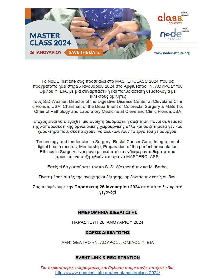 Το Masterclass 2024 που διοργανώνει το NoDE Institute τελεί φέτος, όπως και κάθε χρόνο, υπό την αιγίδα της Ελληνικής Εταιρείας Χειρουργικής Ογκολογίας.